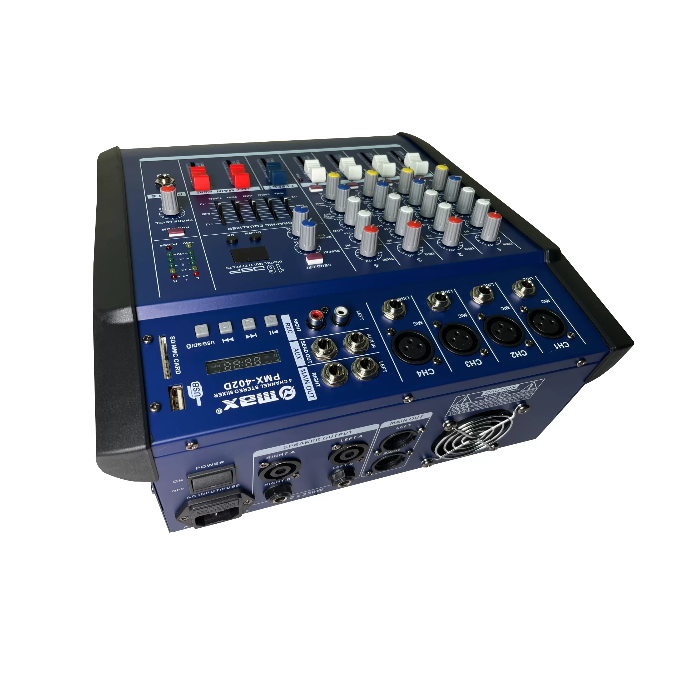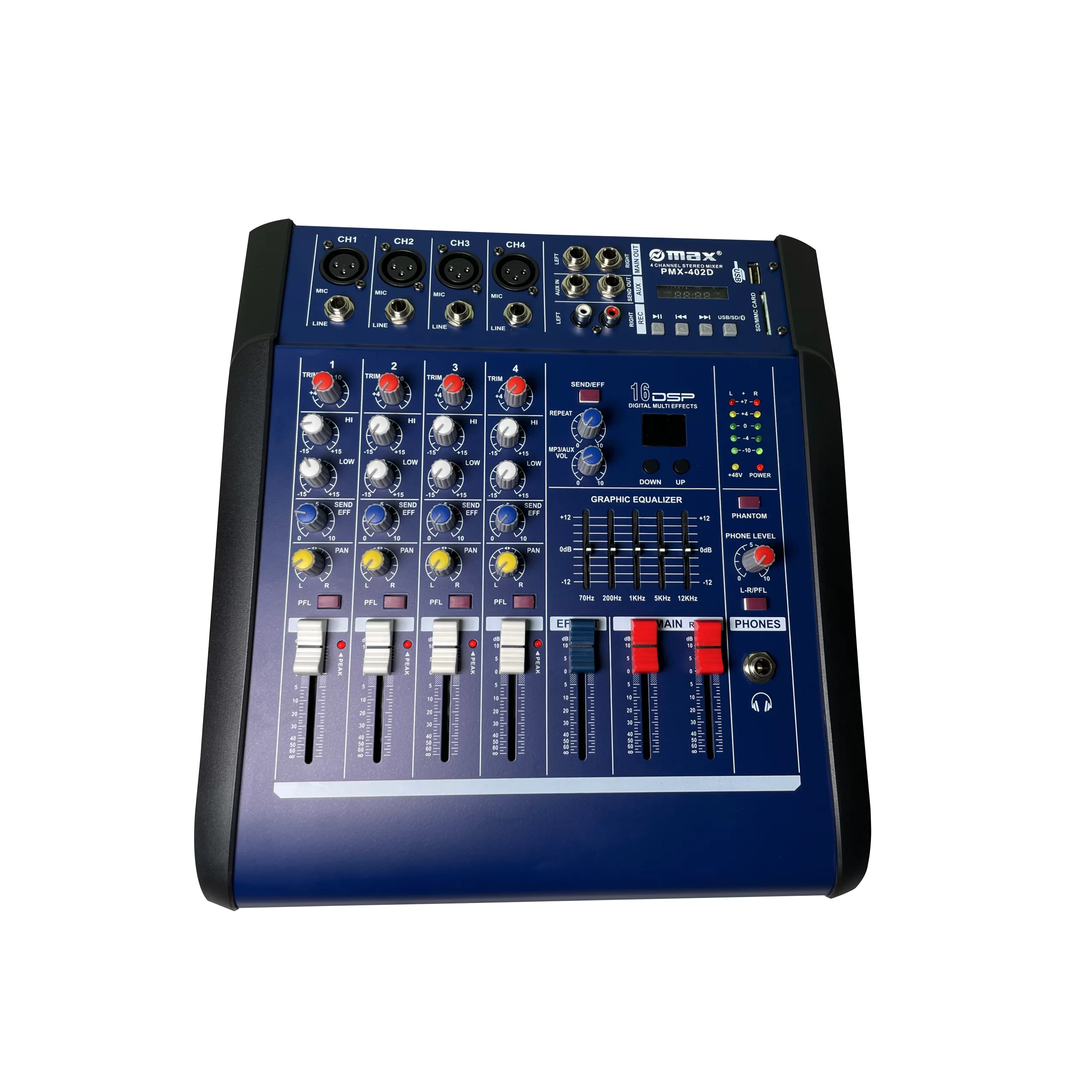 4 Channels mixer with DSP Amplifier effects & mp3 player, USB, BLUETOOTH. 4 5 8-way two-channel stereo inputs. A single channel has a breakpoint insertion. European style three-stage channel EQ equalizer. It offers 16 kinds of digital effects. Grouping can be done with 2 auxiliary outputs. comes with a built-in amplifier 2 x 250W4. Made with Europe technology. Has a double master EQ+48 V phantom power.